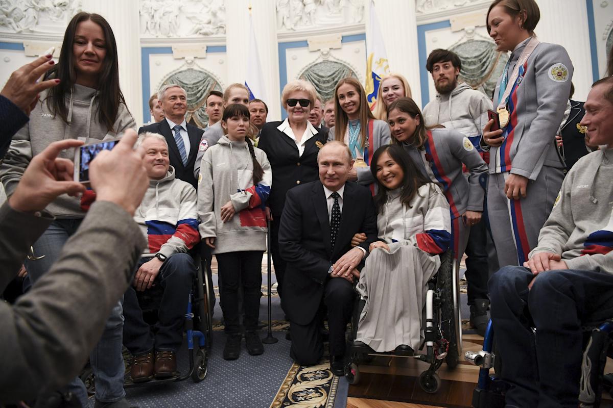 Vladimir Putin con los atletas paralímpicos de Rusia que se encuentran en China: el Comité Olímpico acaba de excluirlos de los Juegos de invierno Beijing 2022. (Foto: Reuters)