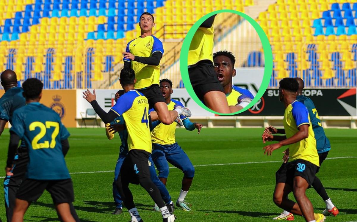 Y en una curiosa imagen, durante la práctica del Al-Nassr se puede ver que en un tiro de esquina como el Bicho se levanta por los aires, como suele ser una costumbre, para intentar conectar el esférico.