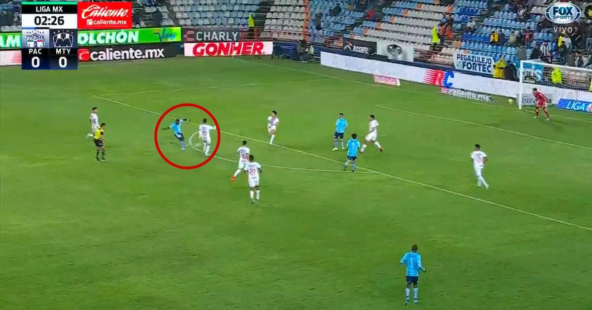 En una jugada relámpago, Pachuca recuperó el balón en media cancha, desdobló con rápides de derecha a izquierda y justo el balón le cayó a Hinestroza, quien antes de controlar, sufrió un pequeño resbalón, pero recuperó la postura a tiempo.
