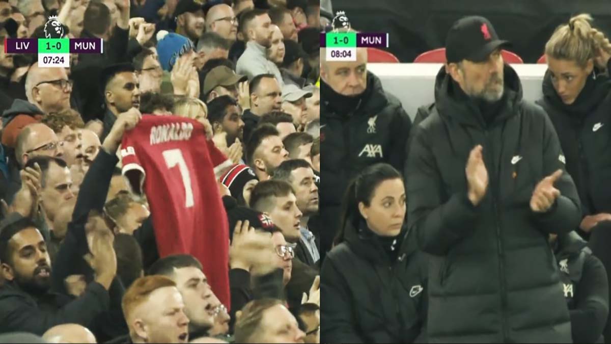 La afición de Liverpool en Anfield se solidarizó por la grave pérdida de CR7 / Foto: Twitter (@luisrha)