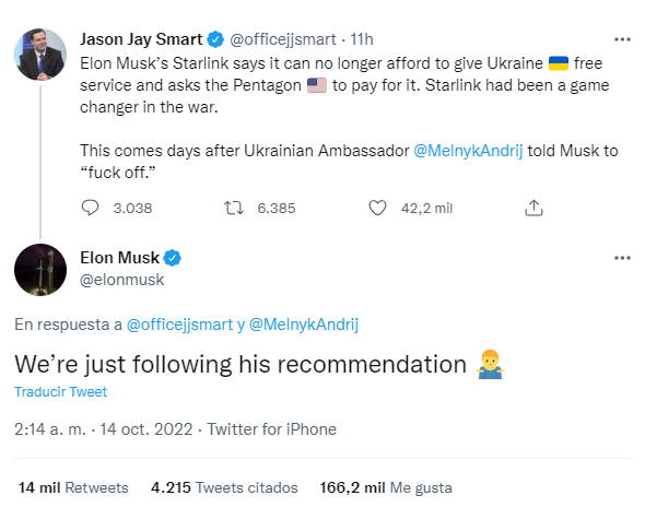 “Solo estamos siguiendo su recomendación”, dijo Elon Musk este viernes, respondiendo a un tuit que hacía referencia a los informes de CNN y los comentarios de Melnyk.