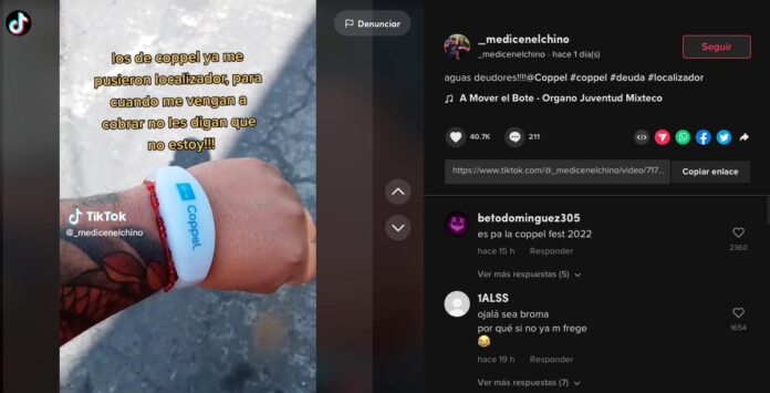 “Aguas los de Coppel están poniendo este localizador a deudores”, dice el video del usuario @_medicenelchino, que muestra una pulsera con el logo de la firma.