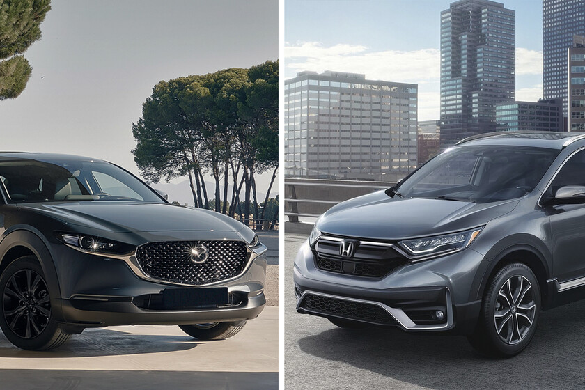 Mazda sigue fiel a su propuesta de elevar poco a poco su nivel para aspirar a mercados más selectos y su siguiente paso es ofrecer un Mazda CX-30 S Grand Touring con motor turbo y un nivel de equipo suficientemente bueno para poner en aprietos a rivales algo más grandes, por ejemplo al Honda CR-V en su versión Turbo Plus, la intermedia en su gama. Dos SUV con algunos enfoques distintos, pero un precio muy parecido. ¿Cuál es la mejor compra?