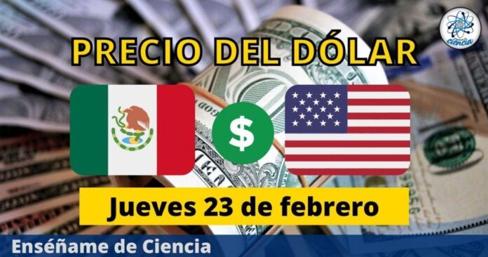 El peso se fortalece frente al dólar. Este jueves 23 de febrero, el dólar estadounidense en México se cotiza en promedio en: 18.4034 pesos, según los datos de PesoMXN.com. Se observa una pequeña diferencia frente a ayer que se cotizaba en 18.44 pesos. Con respecto al promedio en la compra, el día de hoy se ubica en 18.145 pesos, y la venta a 18.7923 pesos. (Actualización: 7:00 a.m.).