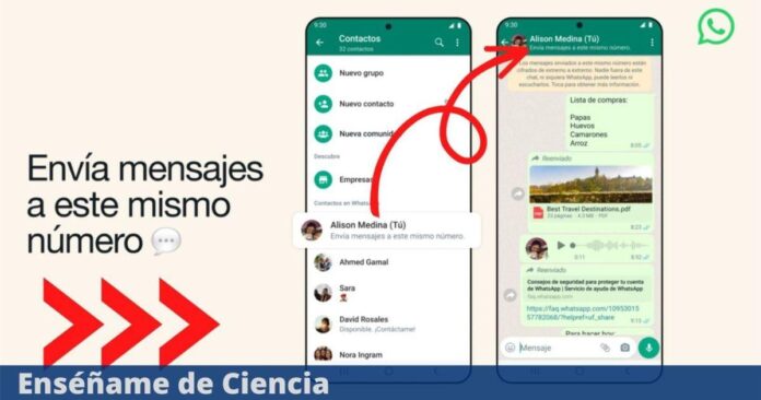 El procedimiento es sumamente sencillo, solo deberás presionar en nuevo chat como si le fueras a enviar mensaje a cualquier contacto. A continuación, debes seleccionar tu propio número que aparecerá adelante en la lista y eso es todo. Si todavía no captas la idea, sigue los siguientes pasos: