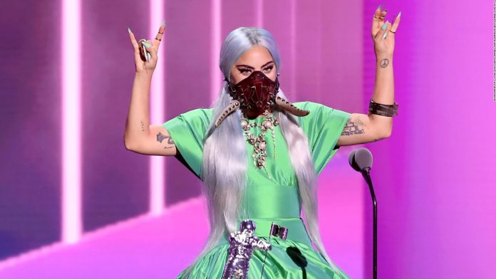 Lady Gaga mostro sus diferentes tapabocas durante los premios MTV, Video Music Awards. La más sencilla, fue la mascarilla plateada con la que recibió el premio Tricon como Artista del Año. La cantante recibió uno de sus premios con un tapabocas con cuernos, otro que parecía salida de una era apocalíptica y durante su presentación de «Rain On Me», junto Ariana Grande, la cantante utilizó un cubrebocas con luces que se encendían cuando cantaba.