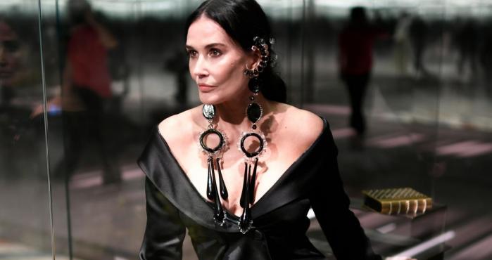 Demi Moore cautivó ataviada con un conjunto negro satinado de hombros descubiertos y mangas largas. Completaron su look con pendientes de aro extralargos y lució un rostro maquillado con tonos neutros.