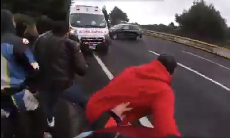 En la autopista México-Cuernavaca, las propias cámaras de motociclistas captaron un fuerte accidente, y el momento justo cuando una camioneta pierde el control y los atropella tras detenerse en una orilla a auxiliar a un compañero accidentado.