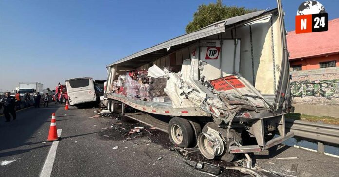Un violento choque entre un tráiler y una unidad de transporte público paralizó el Circuito Exterior Mexiquense esta mañana. El accidente ocurrió en el kilómetro 39, cerca de la caseta de Las Américas en Ecatepec, dejando al menos 10 personas lesionadas y una atrapada entre los hierros retorcidos del autobús.