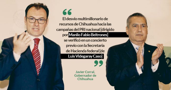 “No vamos a cejar hasta que los procesos se lleven hasta el fondo y hasta sus últimas consecuencias. Hasta donde tope. No vamos entrar en negociaciones”, aseguró Corral. “El desvío multimillonario de recursos de Chihuahua hacia las campañas del PRI nacional [dirigido por Beltrones Rivera] se verificó en un concierto previo con la Secretaría de Hacienda federal [de Videgaray Caso], porque fue un modelo que se utilizó en Chihuahua y otras entidades para distraer recursos públicos”.