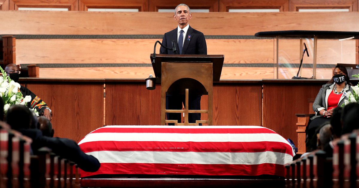 Barack Obama pronuncia un discurso durante el funeral del difunto congresista estadounidense John Lewis, pionero del movimiento de derechos civiles y miembro de la Cámara de Representantes de los Estados Unidos (Alyssa Pointer/Pool via REUTERS)