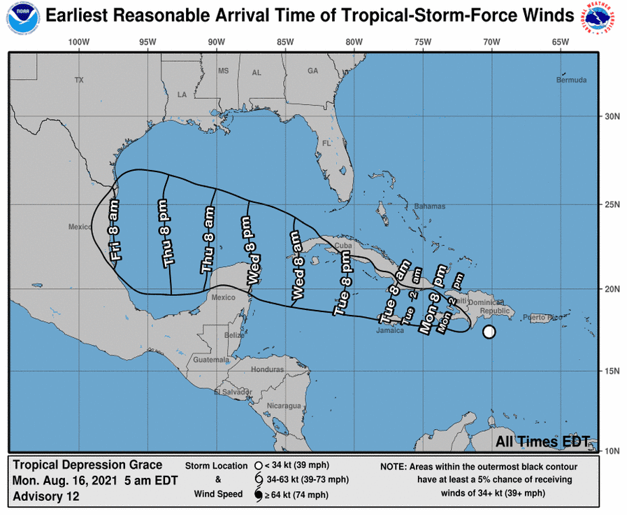 Trayectoria de la depresión tropical “Grace” en los próximos días según pronósticos del Centro Nacional de Huracanes de Estados Unidos