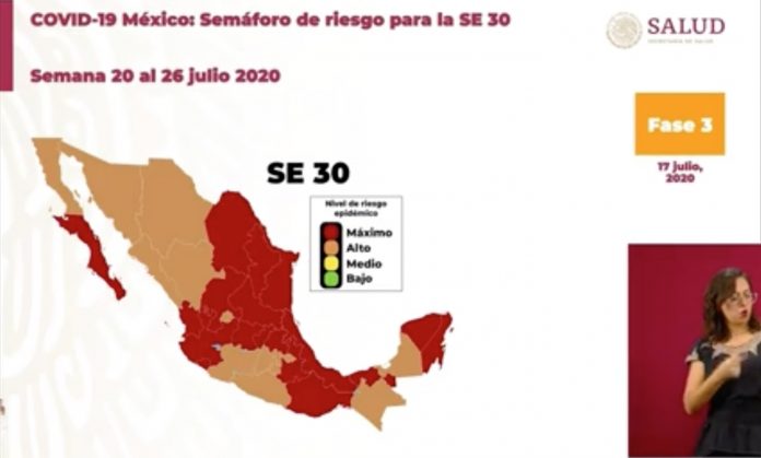 De acuerdo a los nuevos parámetros para la semana 30 de la pandemia, ningún estado cambia a amarillo o verde, de tal modo, 18 quedan en rojo y 14 en color naranja.