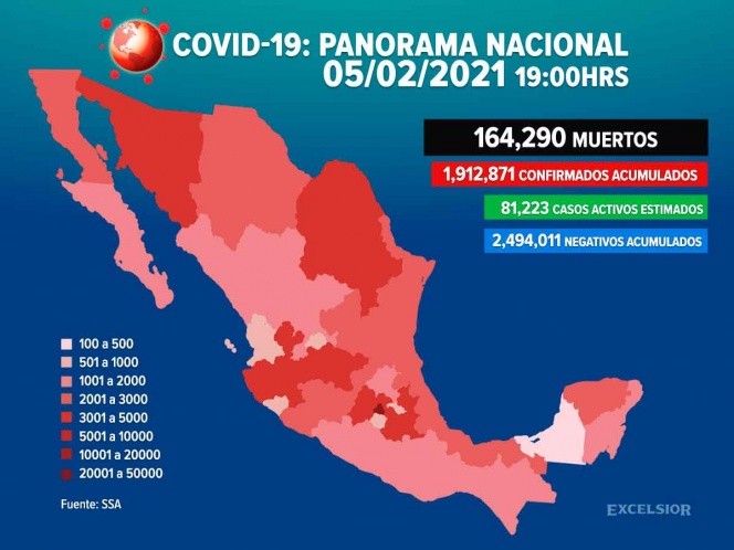 En el primer viernes de febrero, en el que la Ciudad de México y el Estado de México continuarán en semáforo rojo, el país registró 164 mil 290 fallecidos por la pandemia de Covid-19, de acuerdo con cifras oficiales, mientras que el número de contagios por este patógeno suman ya un millón 912 mil 871 casos.