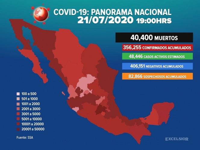 Autoridades de la Secretaría de Salud informaron este día que el número de muertos por coronavirus en México llegó a 40 mil 400, mientras que los casos confirmados alcanzan los 356 mil 255.