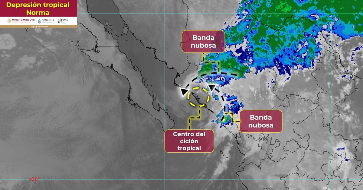 Se espera que la depresión tropical ‘Norma’ se degrade a sistema de baja presión remanente al medio día de este 23 octubre.