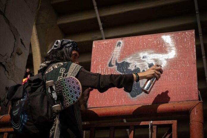 Hay casi más policías que manifestantes. Los agentes provocan a los antitaurinos, la mayoría jóvenes, que provocan de vuelta. Pintan consignas en los muros, corean cánticos con mejor intención que originalidad —“¡Toros sí, toreros no!”—. Tratan de bloquear los accesos a la plaza e interceptar a los asistentes, increpándolos y rodeándolos en alguna ocasión. Un grupo de mujeres hace una performance en medio de la carretera en la que se tumban sobre el asfalto cubiertas de sangre falsa y fingen estar muertas.