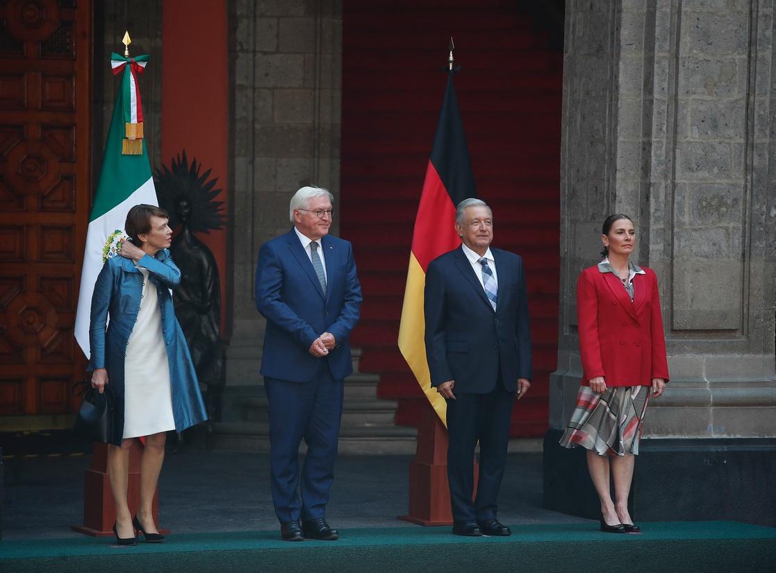Ciudad de México. Al comenzar su visita a México, el presidente de la República Federal de Alemania Frank Walter Steinmeier acudió a Palacio Nacional donde el Jefe del Ejecutivo Andrés Manuel López Obrador le brindó la recepción oficial. Acompañados de sus respectivas comitivas y esposas, escucharon los himnos nacionales.