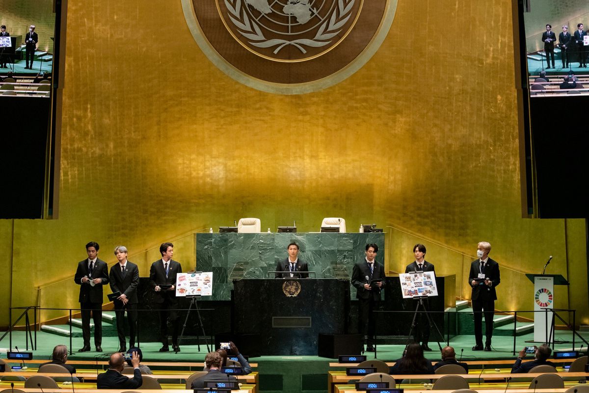 El grupo de K-pop BTS, representante especial de Corea del Sur, en un acto sobre los Objetivos de Desarrollo del Milenio, este lunes en la ONU en Nueva York. Mark Garten / EFE