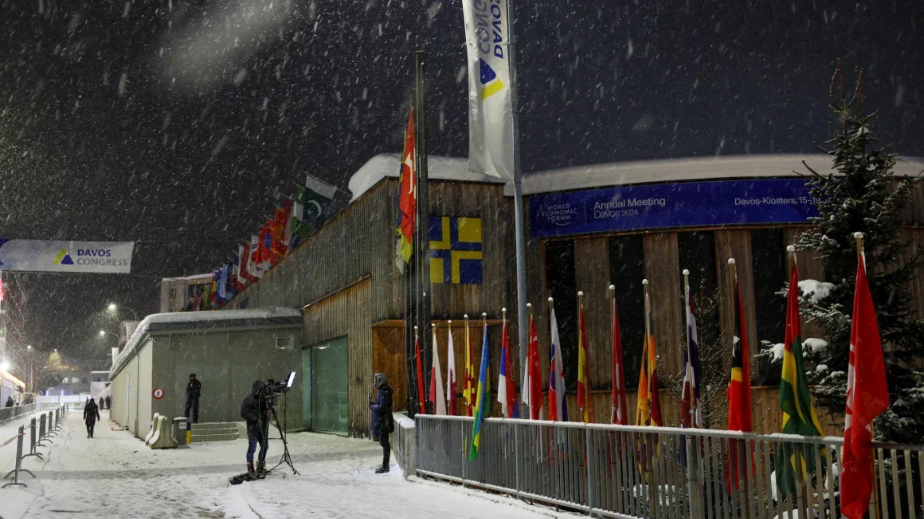 Miembros de los medios de comunicación se encuentran afuera de la sede del Foro Económico Mundial durante una nevada, en el primer día de la reunión anual de 2024 en Davos, Suiza. (Crédito: Denis Balibouse/Reuters)