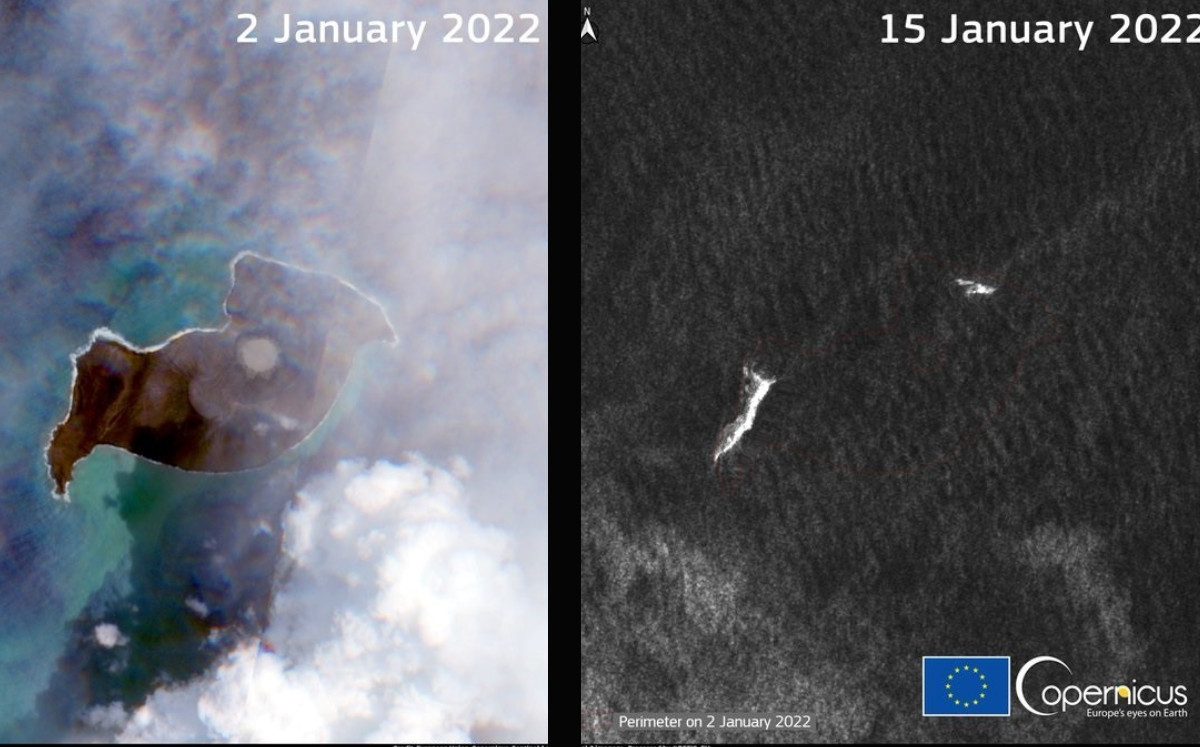 Las imágenes de UNOSAT revelan que a raíz de la erupción solo quedan dos pequeñas porciones de tierra sobre el nivel del mar, mientras que unos días antes estas dos porciones que sobreviven -parte del cono del volcán submarino- eran mucho más grandes y estaban unidas por una lengua de terreno de 1,2 kilómetros de ancho.