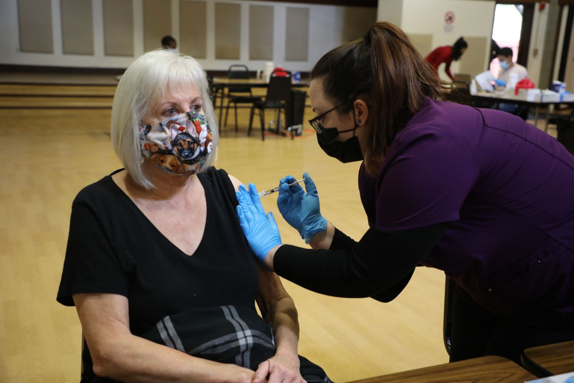 Una persona recibe la vacuna contra el COVID-19 de Pfizer-BioNTech en el Centro Comunitario de Rohnert Park, California, el 27 de enero de 2021. (Jim Wilson/The New York Times).