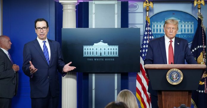 U.S. Treasury Secretary Steve Mnuchin speaks (L) next to U.S. President Donald Trump during a coronavirus disease (COVID-19) pandemic briefing at the White House in Washington, U.S., August 10, 2020. REUTERS/Kevin Lamarque