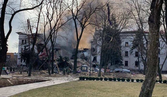 Tras el bombardeo de este miércoles, el Ayuntamiento de Mariupol compartió una imagen del edificio y dijo que las fuerzas rusas habían “destruido a propósito y cínicamente el Teatro Dramático en el corazón de Mariupol”.