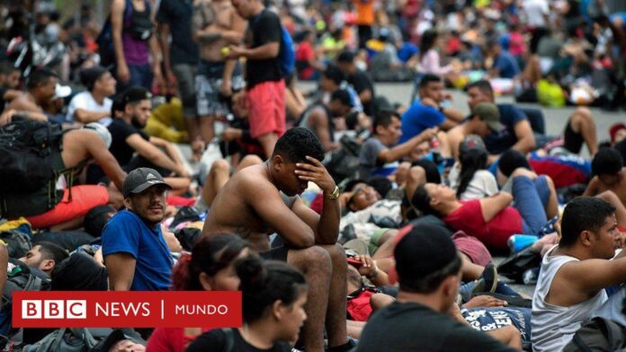 Fuente de la imagen, Getty Images Pie de foto, Migrantes esperan para entrar en territorio estadounidense.