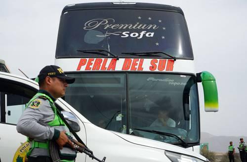 ▲ Un retén policiaco desplegado en la ciudad de Nazca, 450 kilómetros al sur de Lima, detiene a un autobús que transporta a manifestantes de Cusco hacia la capital del país. Foto Afp