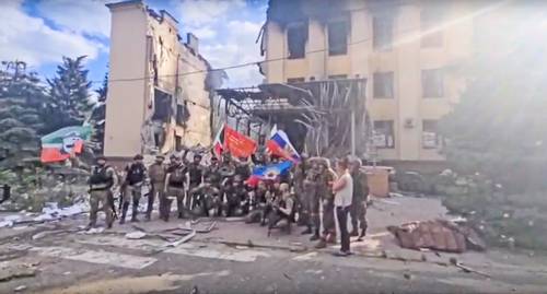 ▲ Tropas rusas, que incluyen soldados del regimiento checheno, se tomaron un video frente a un edificio de Lysychansik. Foto Telegram de Ramzan Kadyrov vía AP