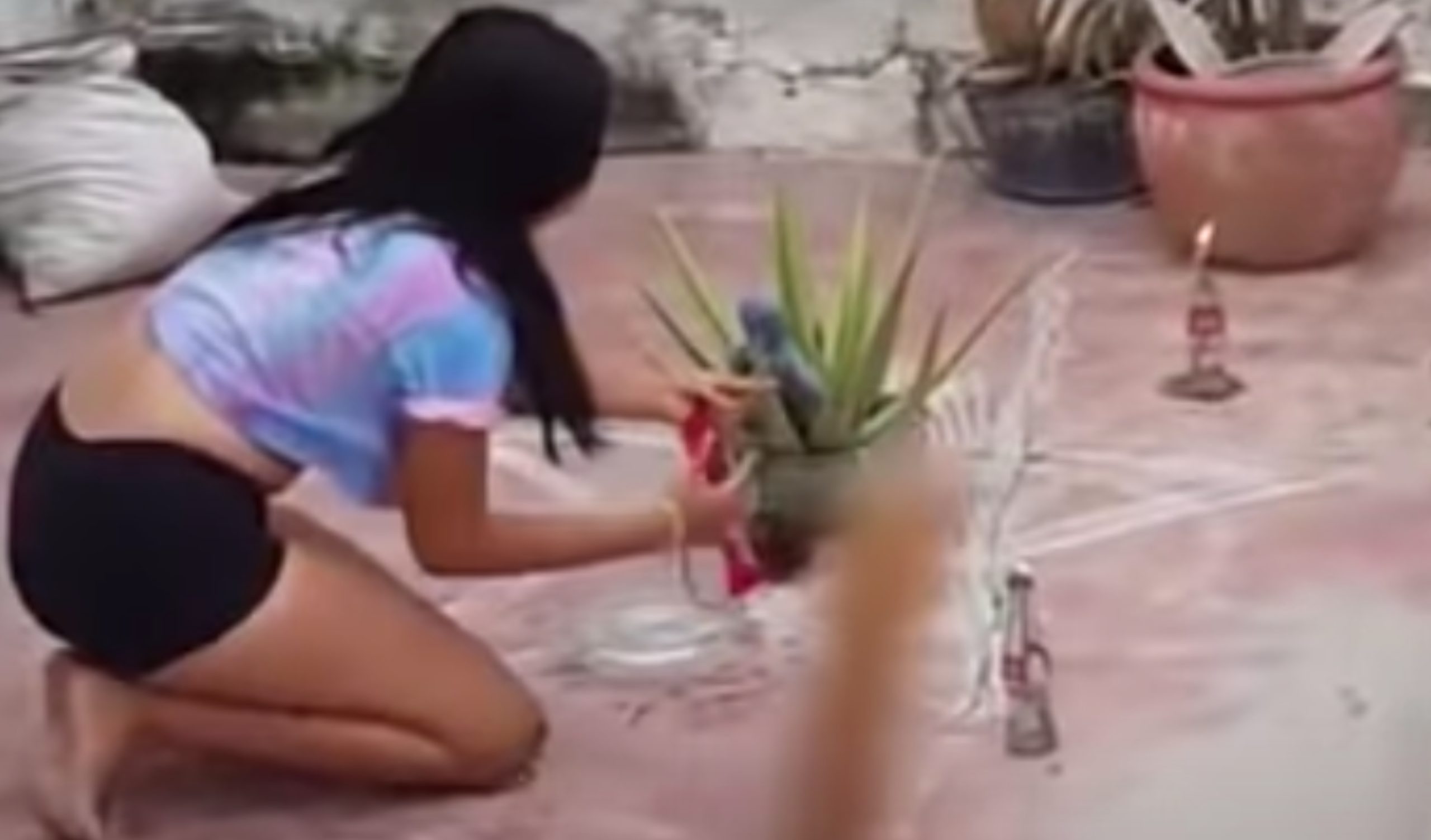El video rápidamente se viralizó, y en él, se escucha al joven decir que la vecina está haciendo un ritual de “agua de calzón” y es que lo que sucede del otro lado de la barda es bastante peculiar, pues la chica arrodillada en pleno pentagrama pintado en gis y rodeada de velas que detiene en envases de una famosa refresquera, parece hablar ante lo que parece un muñeco vudú y en sus manos tiene una prenda roja que parece ropa interior.
