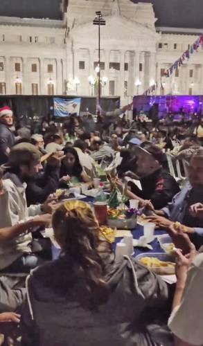 ▲ Más de 4 mil personas que duermen en las calles, entre los más pobres –que aumentan sus cifras cada semana–, participaron antenoche de la cena que el Frente Patria Grande, liderado por el diputado peronista y dirigente social Juan Grabois, organiza desde 2016 en la plaza frente al Congreso, en Buenos Aires. Foto tomada de la cuenta de X de Grabois