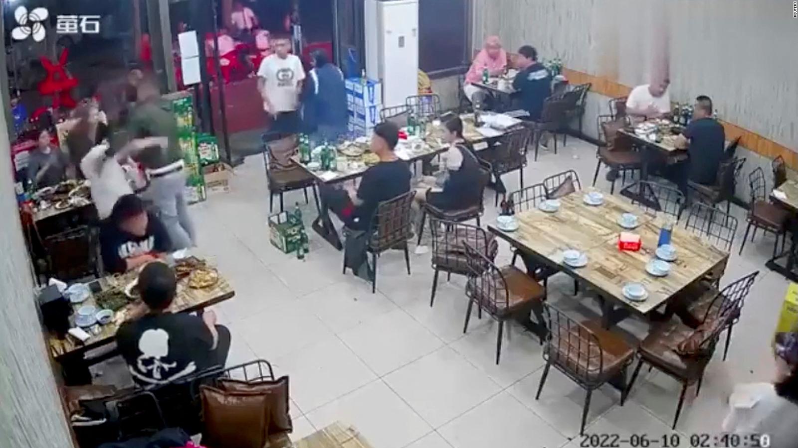 Las imágenes de vigilancia muestran a los amigos de la mujer tratando de detener la pelea y siendo golpeados por el hombre, así como por un grupo de otros hombres que se apresuran a entrar al restaurante.