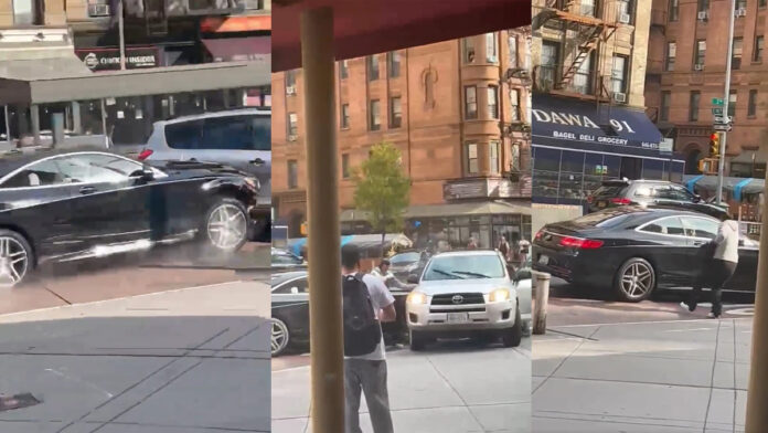 En el video, que fue grabado por un viandante el sábado, se ve como un Mercedes persigue a un Toyota hasta robar una mochila negra, en la que, según dijo la Policía al New York Post, había 20 mil dólares.