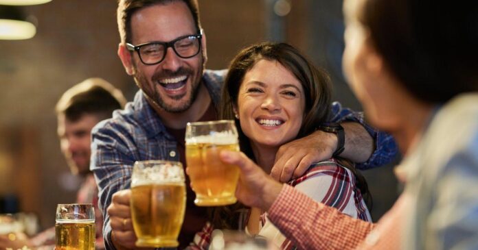 skynesher via Getty Images Una pareja brinda con cerveza en un bar
