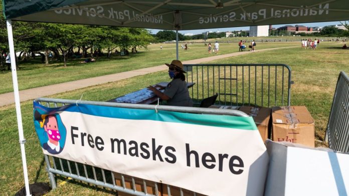 Un guardabosques del Servicio de Parques de EE. UU. Se prepara para distribuir máscaras faciales a las personas que se reúnen cerca de los fuegos artificiales del Día de la Independencia el 4 de julio de 2020
