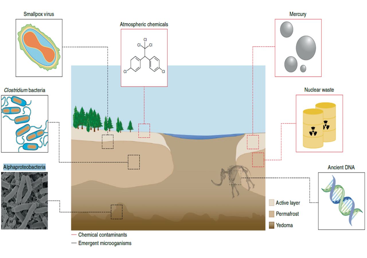 Se describe cómo el permahielo profundo, a una profundidad de más de tres metros, se han descubierto que más de 100 microorganismos diversos, una de las regiones de mayor interés fue el permafrost profundo de Siberia donde los virus son resistentes a los antibióticos modernos. Otro riesgo también, son los subproductos de los combustibles fósiles, que se han introducido en los entornos de gelisuelo desde el comienzo de la revolución industrial.