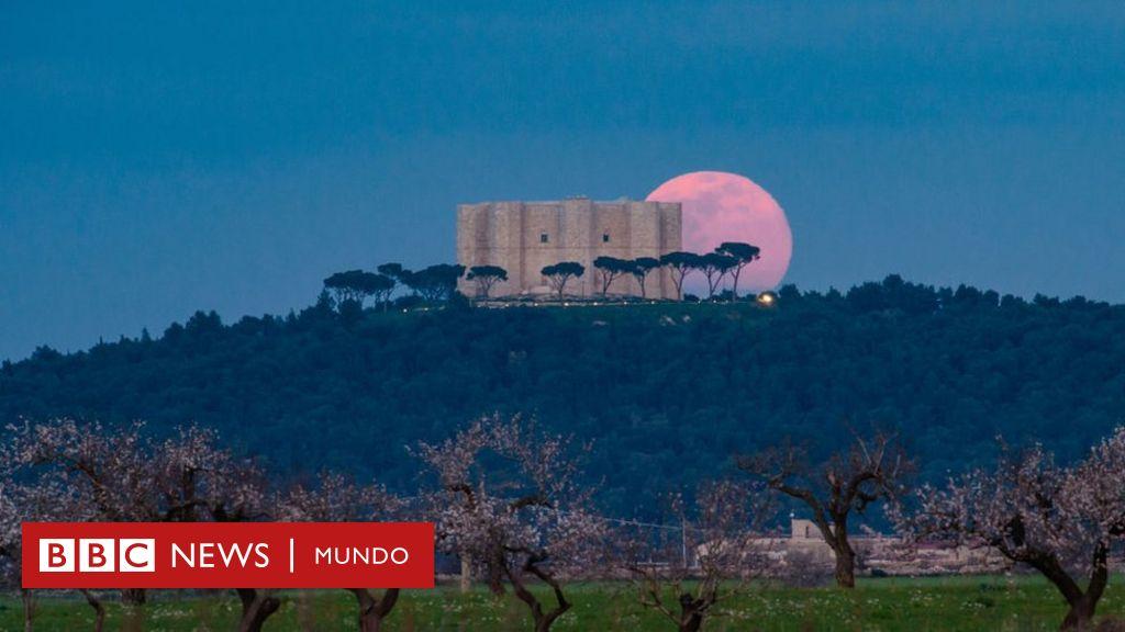 Fuente de la imagen, Getty Images Pie de foto, La luna llena sale detrás del Castel del Monte en Andria, Italia.