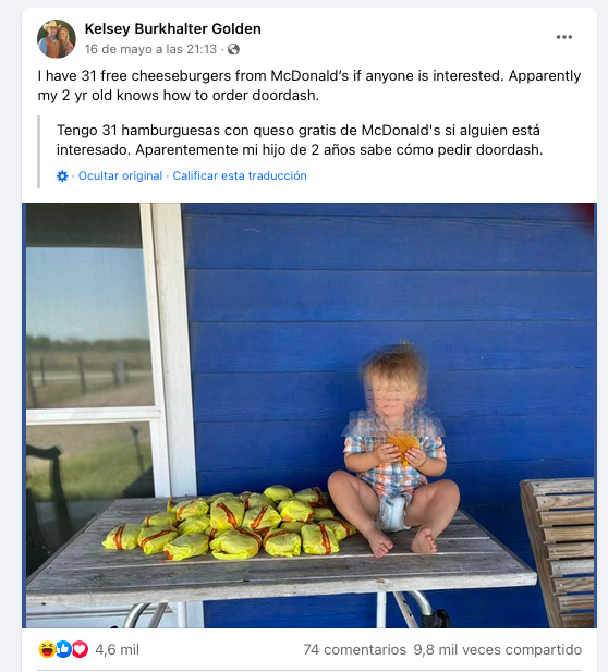 Entonces fue cuando se le ocurrió publicar una foto en su página de Facebook de su hijo junto al montón de hamburguesas ofreciéndolas gratis. De ahí, a la viralidad. El mensaje era el siguiente: “Tengo 31 hamburguesas con queso gratis de McDonald’s si alguien está interesado. Aparentemente mi hijo de 2 años sabe cómo pedir en Doordash”. Compartido casi 10.000 veces, han sido muchas las cadenas estadounidenses que se han puesto en contacto con ella para entrevistarla. A ella y al pequeño Barrett.