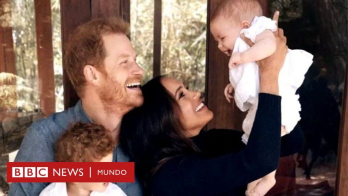 La imagen -que aparece en la tarjeta navideña de la pareja- muestra a Meghan levantando a Lilibet en brazos junto al príncipe Harry, quien sostiene a su hijo Archie de dos años sobre sus rodillas.