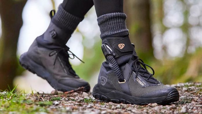 Un collar rígido envuelto cómodamente alrededor del tobillo unido a la parte superior del cuerpo de la bota con un material flexible que permite que el pie gire cómodamente al atravesar rocas, raíces y otros obstáculos. El collar del tobillo también está anclado a un punto más bajo en la bota con lo que parece ser una correa de goma gruesa en el exterior. Pero el collar en sí es solo una funda para la tecnología real.