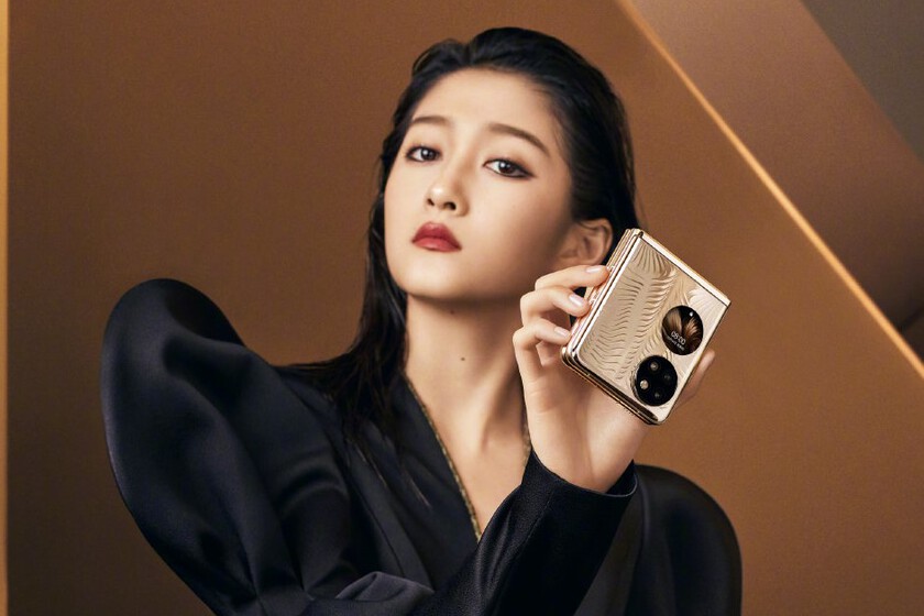 Las primeras fotografías oficiales del Huawei P50 Pocket fueron compartidas por la tienda de moda Harper’s Bazaar China en Weibo, y muestran la versión en color dorado con un llamativo acabado de ondas y la presencia del doble aro en la parte posterior, pero ahora formado por el módulo de cámaras y una segunda pequeña pantalla exterior.