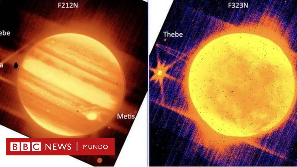Las dos fotos muestran la circunferencia de Júpiter y tres de sus satélites naturales: Metis, Europa y Tebe.