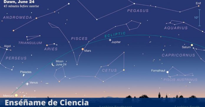 ¿Qué más puedo ver en estos días? Además de este evento, la fecha más cercana que podemos destacar para ver planetas es el 16 de junio – Mercurio en su mayor elongación occidental. De acuerdo con The Sky, el planeta Mercurio alcanza su mayor elongación occidental de 23.2 grados respecto al Sol. Este es el mejor momento para ver Mercurio ya que estará en su punto más alto sobre el horizonte en el cielo de la mañana. Busque el planeta bajo en el cielo oriental justo antes del amanecer.