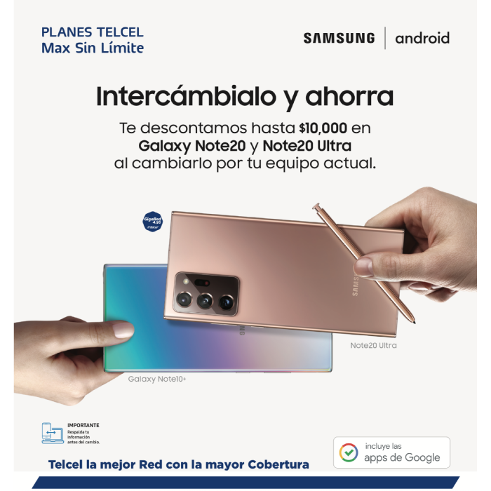 Promoción válida en Centros de Atención a Clientes en toda la República mexicana, excepto en CDMX., Estado de México, Hidalgo y Morelos del 01 al 30 de septiembre del 2020. Promoción Samsung “Cambia tu Smartphone” permitirá a los usuarios activos que renueven su Plazo Mínimo de Contratación (PMdC) con un Plan Tarifario de la familia Telcel Max Sin Límite con PMdC de 24 meses (abierto o mixto/consumo controlado), intercambiar su Smartphone original participante por un bono de descuento con un valor asignado y utilizarlo en la diferencia a pagar por un nuevo equipo Galaxy S10e, S10, S10+, S10 Lite, Galaxy Note10, Note10+, Galaxy Fold, Galaxy S20, S20+, S20 Ultra, Galaxy Z Flip, Galaxy Note20 y Note20 Ultra, al renovar su Plan Tarifario sujeto a un PMdC de 24 meses (la línea debe estar activa y al corriente de pago). Promoción sujeta a la evaluación del Smartphone original participante en el Centro de Atención a Clientes Telcel. El usuario debe entregar el Smartphone participante cediendo la propiedad y los derechos del mismo, y este deberá cumplir con las condiciones de tipo estéticas y de funcionamiento establecidas en la promoción de Samsung “Cambia tu Smartphone”. Si el bono con valor asignado excede el valor del equipo deseado, no se regresará en dinero el saldo restante. El bono con valor asignado que se entrega al usuario debe ser cambiado el mismo día que se realizó el trámite y en el mismo Centro de Atención a Clientes Telcel. Solo aplica 1 bono con valor asignado por equipo adquirido. No es acumulable, canjeable por dinero o transferible y solo podrá utilizarse en la compra de un nuevo equipo Samsung participante. Los equipos que se presenten para ser cambiados por medio de la promoción de Samsung “Cambia tu Smartphone”, pueden ser de Telcel o de alguna otra compañía. No disponible para equipos que se encuentren reportados como robados o extraviados. Equipos participantes en la promoción de Samsung “Cambia tu Smartphone”: Samsung Galaxy Note10+ (bono por cambio de equipo de hasta $10,000), Samsung Galaxy S10+ y Galaxy Note10 (bono por cambio de equipo de hasta $9,000), Samsung Galaxy S10 (bono de cambio de equipo de hasta $8,000), Samsung Galaxy S10e (bono de cambio de equipo de hasta $7,000), Samsung Galaxy Note9 (bono por cambio de equipo de hasta $6,000), Samsung Galaxy S9+ (bono por cambio de equipo de hasta $5,500), Samsung Galaxy S9 y Galaxy Note8 (bono por cambio de equipo de hasta $5,000), Samsung Galaxy S8+ (bono por cambio de equipo de hasta $4,500), Samsung Galaxy S8 (bono por cambio de equipo de hasta $4,000), Samsung Galaxy S7 y Galaxy S7 edge (bono por cambio de equipo de hasta $3,000), Samsung Galaxy S6+ (bono por cambio de equipo de hasta $2,000), Samsung Galaxy S6 (bono por cambio de equipo de hasta $1,500) y Samsung Galaxy Note5 (bono por cambio de equipo de hasta $1,000). Imágenes ilustrativas. Los precios publicados incluyen 16% de IVA. Equipos y colores sujetos a disponibilidad en punto de venta. Información de Planes Telcel Max Sin Límite en www.telcel.com. Información de la promoción en www.samsung.com y Centros de Atención a Clientes Telcel. *IVA incluido. Google es una marca de Google LLC.