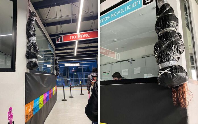 En la estación Campos Revolución, los empleados colgaron boca a bajo a las dos figuras que estaban envueltas en bolsas de plástico negras; una de ellas incluso tenía una peluca de mujer.