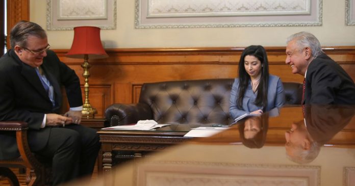 El presidente Andrés Manuel López Obrador y el canciller Marcelo Ebrard, en conversación telefónica con la vicepresidenta de EU, Kamala Harris. (Twitter @lopezobrador_)