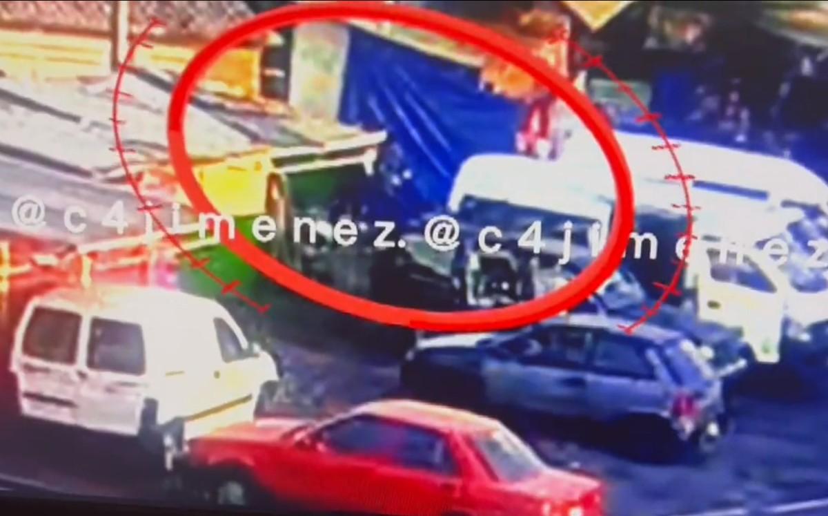 En el video se puede apreciar que el hombre viste un chaleco negro y playera blanca de manga larga, quien aparentemente lleva a la joven hacia la parte trasera de unas camionetas.