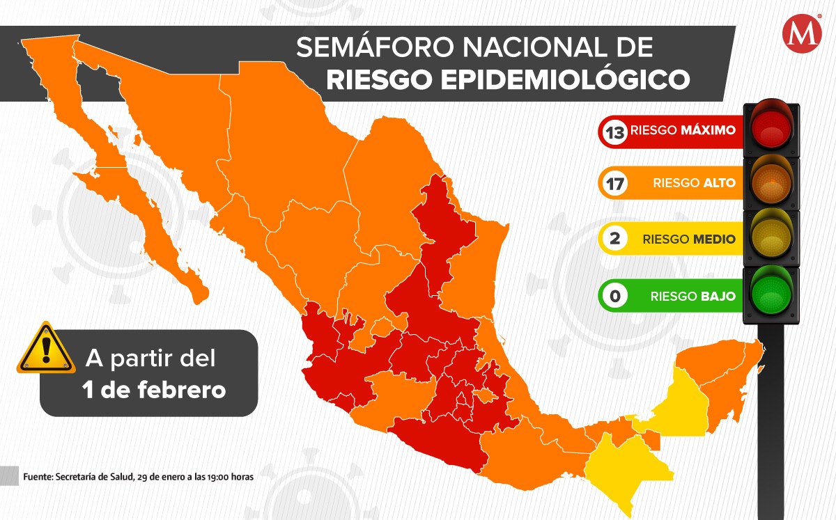 Ciudad de México, Estado de México, Morelos, Nayarit, Puebla, Nuevo León, Jalisco, Querétaro, Hidalgo, Guerrero, Colima, Guanajuato son los estados que se encuentran en semáforo rojo por covid-19, esto quiere decir que la mayoría de las actividades en esas entidades están restringidas debido al aumento de la ocupación hospitalaria, el aumento de casos, entre otros rubros.